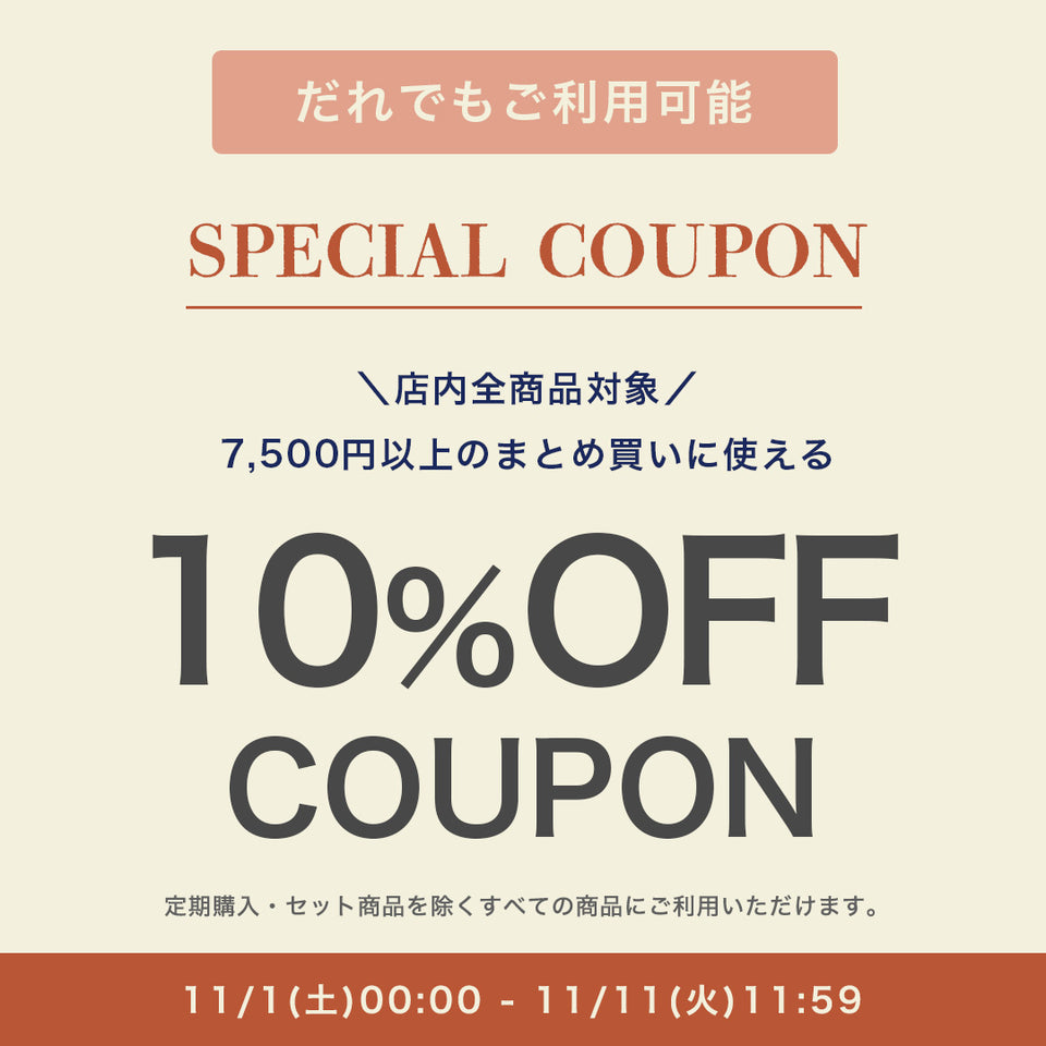 店内ほぼ全品対象7,500円以上のお買い物で使える10%OFFクーポンコードを配布中!